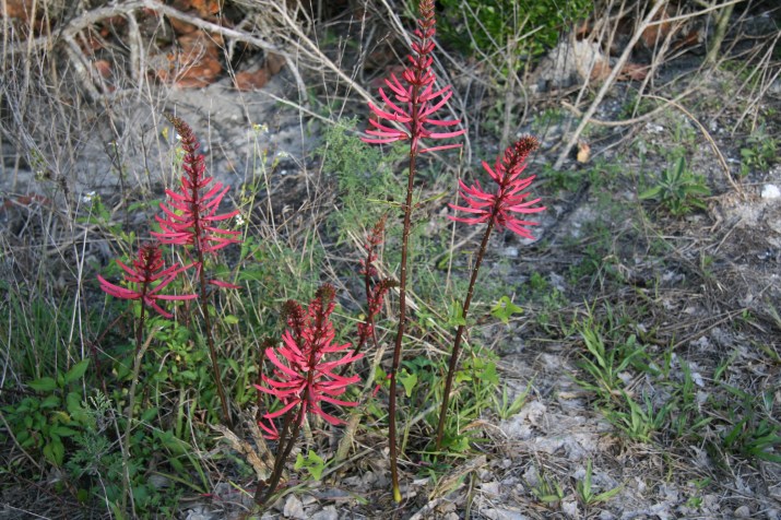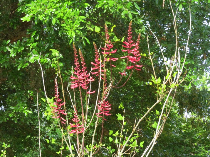 Look for the striking scarlet spikes of coralbean (Erythrina herbacea) flowers rising up from saw palmettos (Serenoa repens) and other plants as you travel about in our car, as you walk in natural areas, and as you visit yards with native plants.