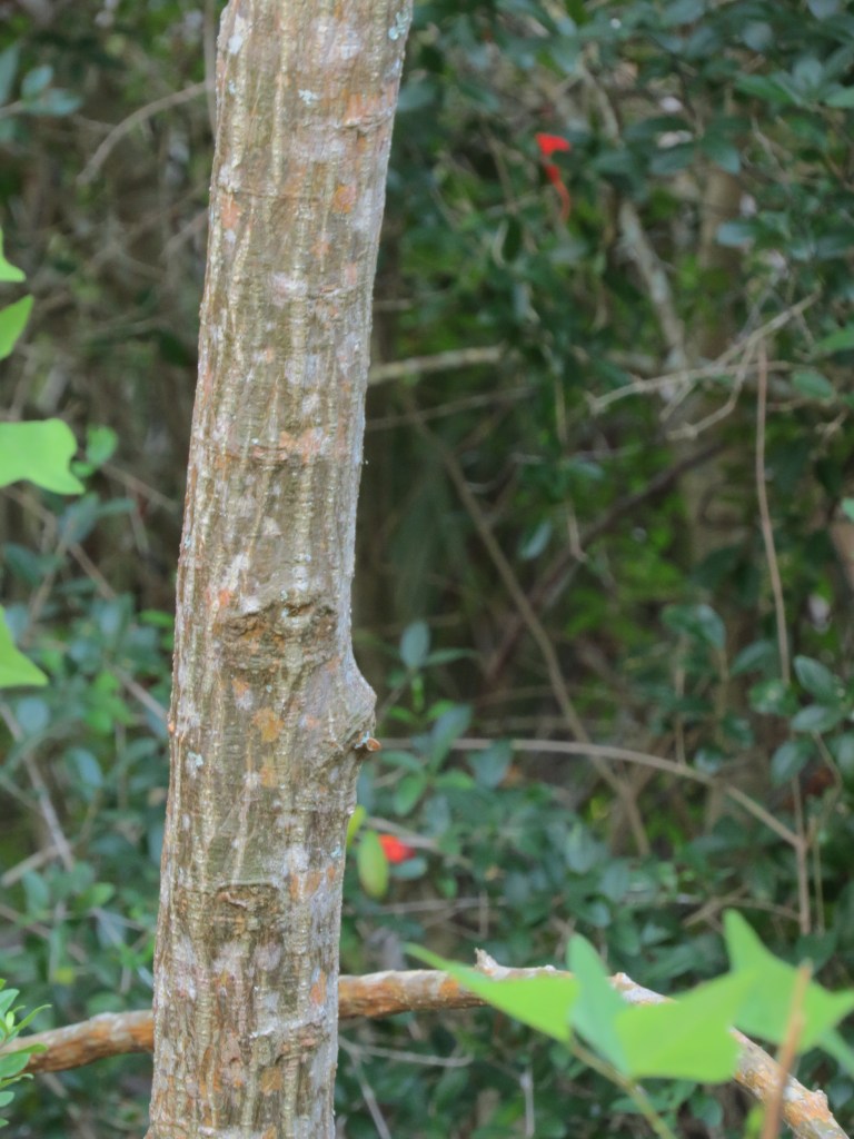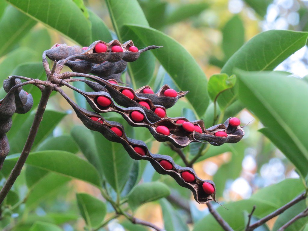 The name coralbean refers to the color its hard-coated seeds which are poisonous and are shown below growing in the midst of a strangler fig (Ficus aureum) in the yard of Marta & Mike Kendrick when the Chapter visited on 5-21-2015.