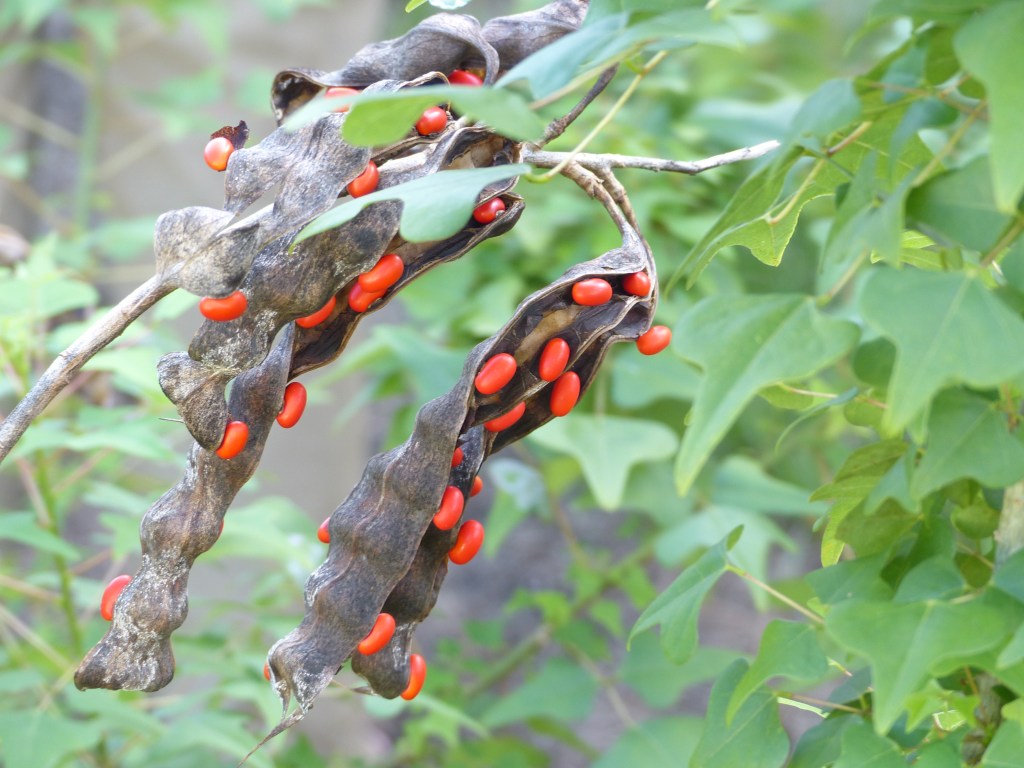 Corlbean grows to be a small tree where conditions are more tropical, so be prepared to prune if you want a shrub. As with many plants of tropical origin, the timing of flowering/fruiting can be quite variable. In our yard, the coralbeans that get “irrigated” by the neighbor’s sprinter system began to flower in December, and a plant in a sandy and shady spot has yet to flower. The photo from the Kendricks’ yard shows fruiting in May, but …
