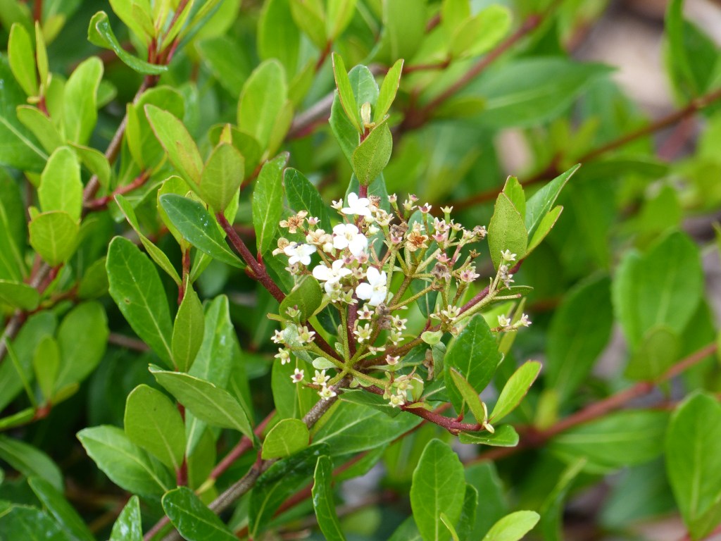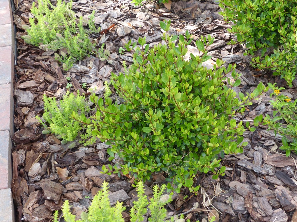 A dwarf variety of Walter’s viburnum (Viburnum obovatum), a.k.a. blackhaw viburnum, also graces this bed and was beginning to flower …