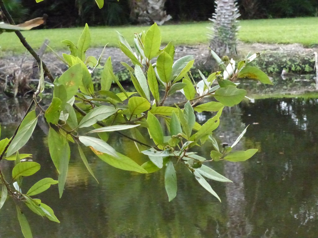 A rare redbay tree (Persea borbonia) also graces the edge of the pond. Most red bay trees have been killed by laurel wilt, an invasive fungal disease vectored by an invasive weevil.