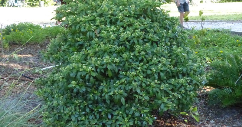 It tends to remain smaller than wild coffee (Psychotria nervosa) and shortleaf wild coffee (Psychotria tenuifolia) which are native to Indian River County. You can see its natural round shape of a young plant in the yard of Terry Greene in August of 2019 …
