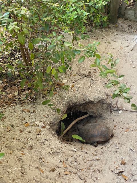 Thanks to all who brought native plants for our plant auction. How many of you saw this big gopher tortoise “ease dropping” at our auction? The burrow is to the left of the main entry doors to the ELC, behind the Simpson’s stopper hedge. I watched him crawl all the way from the east end of the parking lot, cross the road twice and go up over the curb to get to the burrow. Please pay attention when you’re driving your car on the campus!