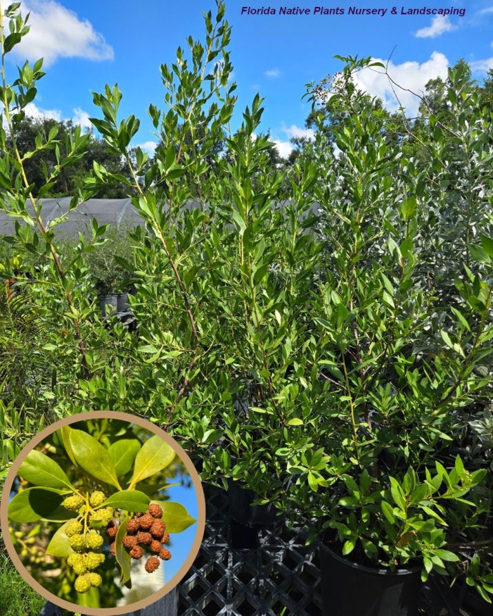 I’d like to highlight what I think is an unsung hero of our native plant palette, the green buttonwood (Conocarpus erectus). In Tom’s yard, it is located on the left side of his property. He has allowed it to grow into a spreading tree form which provides a nice barrier and great shade. He has used it to hang up orchids and Tillandsias. Note the fruit, i.e. the “buttons”, pictured in the insert.