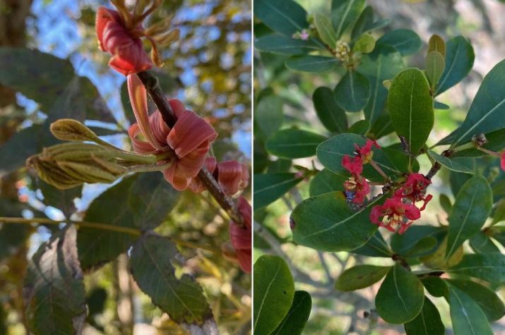 Tom’s “forest” of slash pine (Pinus elliottii) in the back corner of his lot motivated me to plant 12 of my own! I’m envious of his wonderful pignut hickory (Carya glabra), above left, and his cinnamon bark (Canella winterana), above right. Both of these trees have such interesting flowers.
