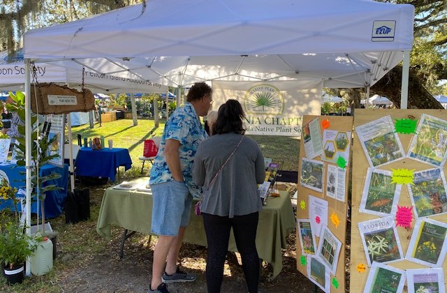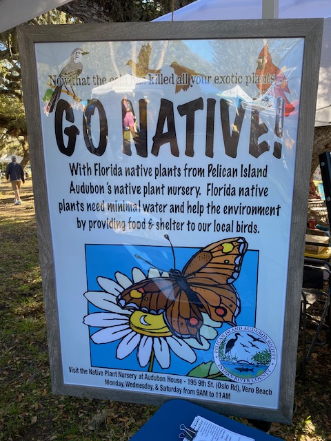 Pelican Island Audubon Society is our neighbor booth, so it’s fun to socialize with those folks whose interests overlap those of our Eugenia Chapter members. They had a clever new poster prominently displayed: “Now that the cold has killed all your exotic plants . . . “